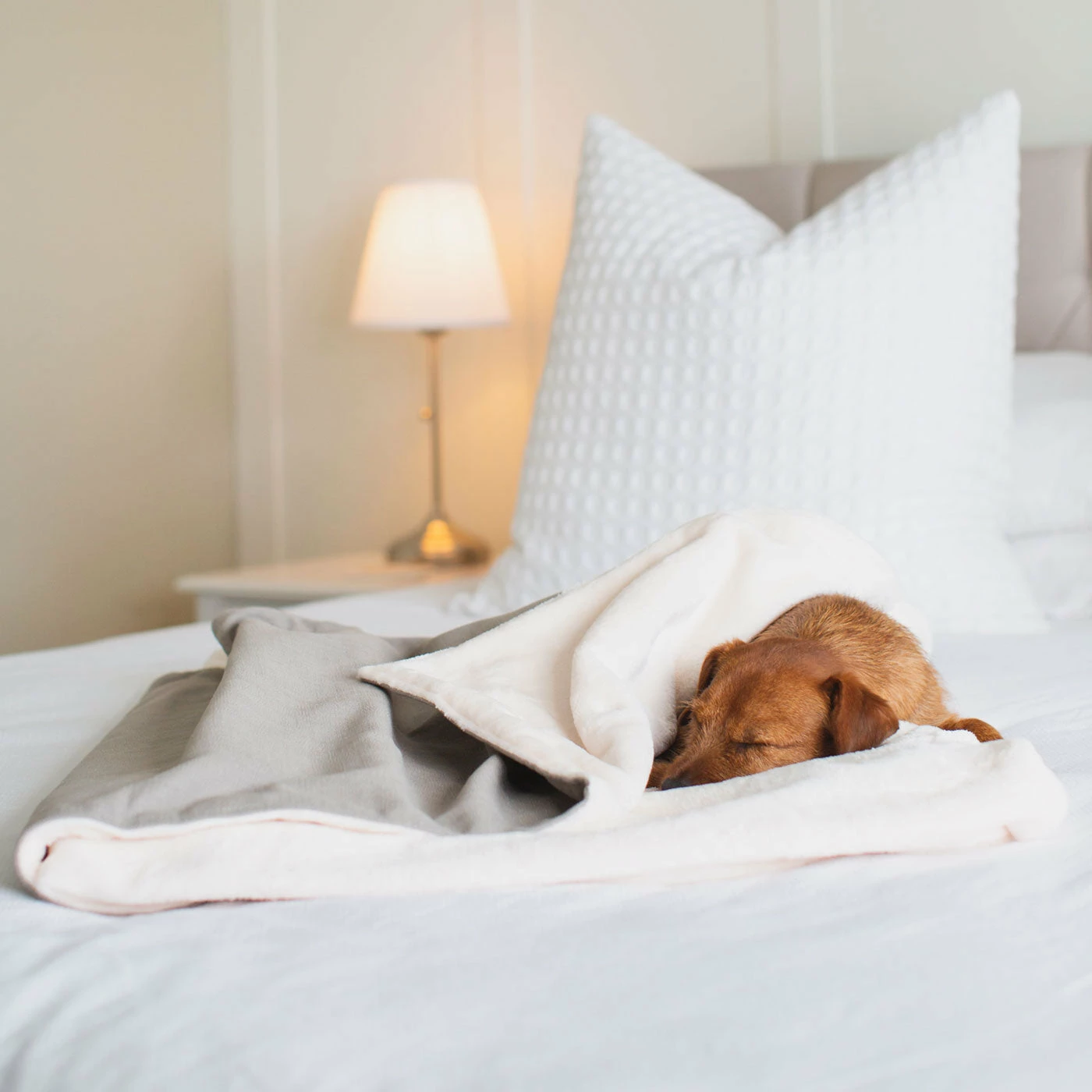 โขย Luna is pictured waiting for treats on our large Savanna Indigo blanket
