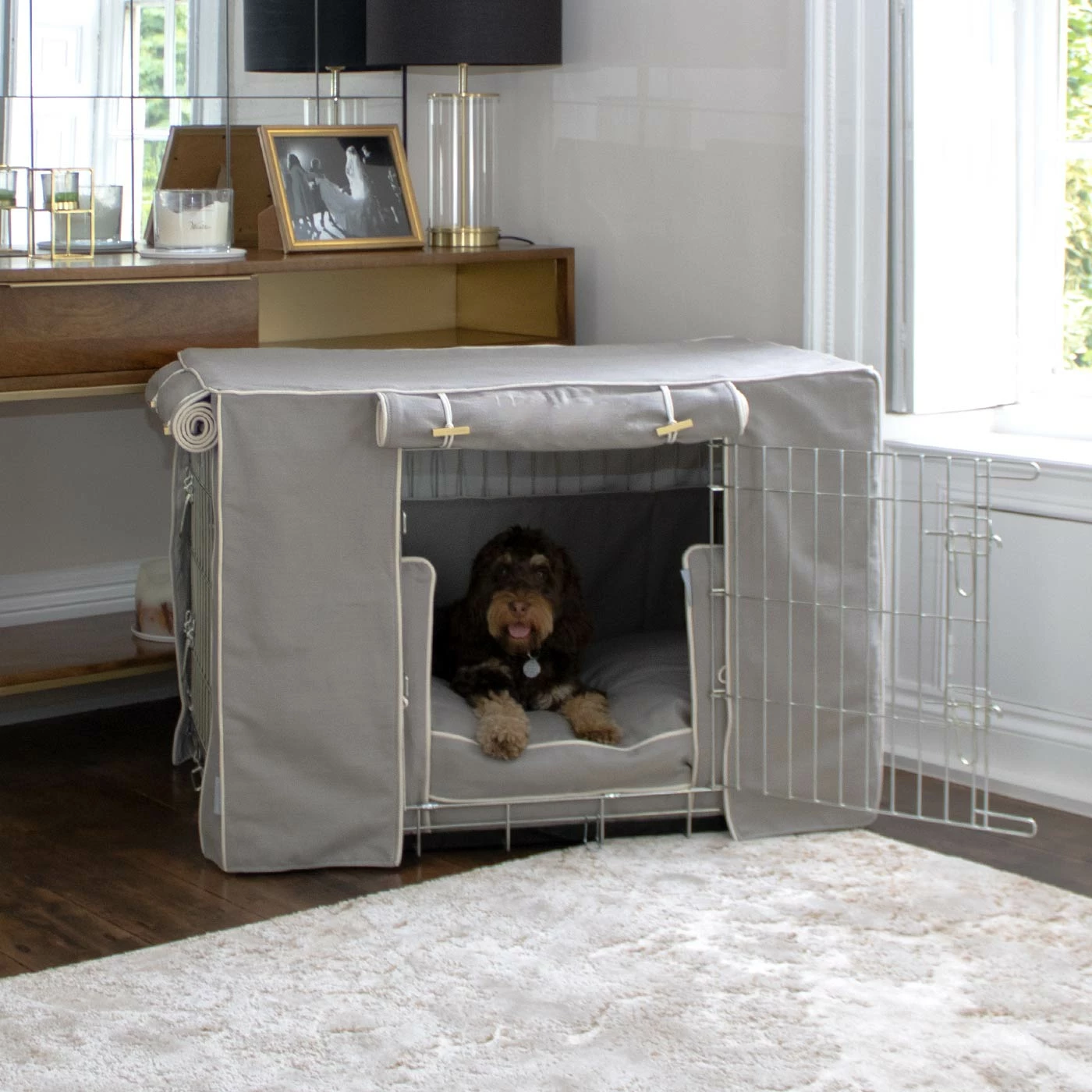 โข Fully lined cotton dog crate cover with roll up doors