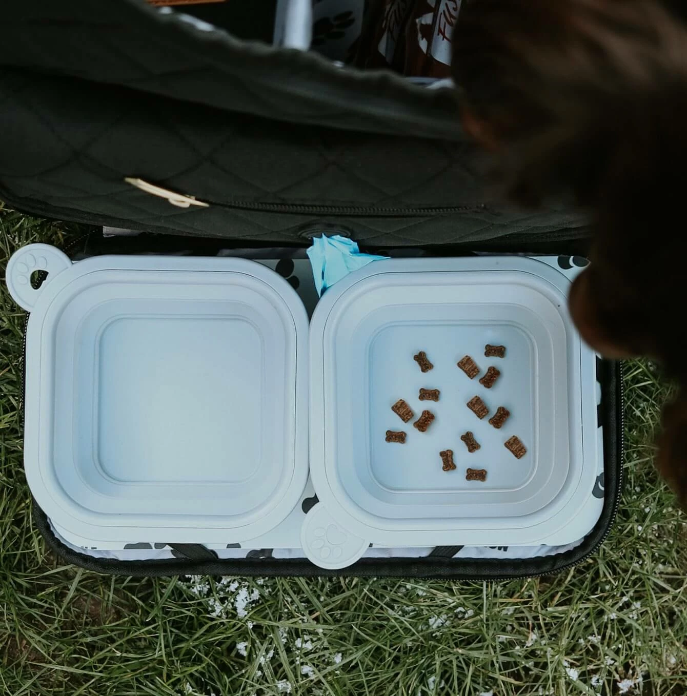 • Collapsible silicone bowls and placemat store conveniently in front flap